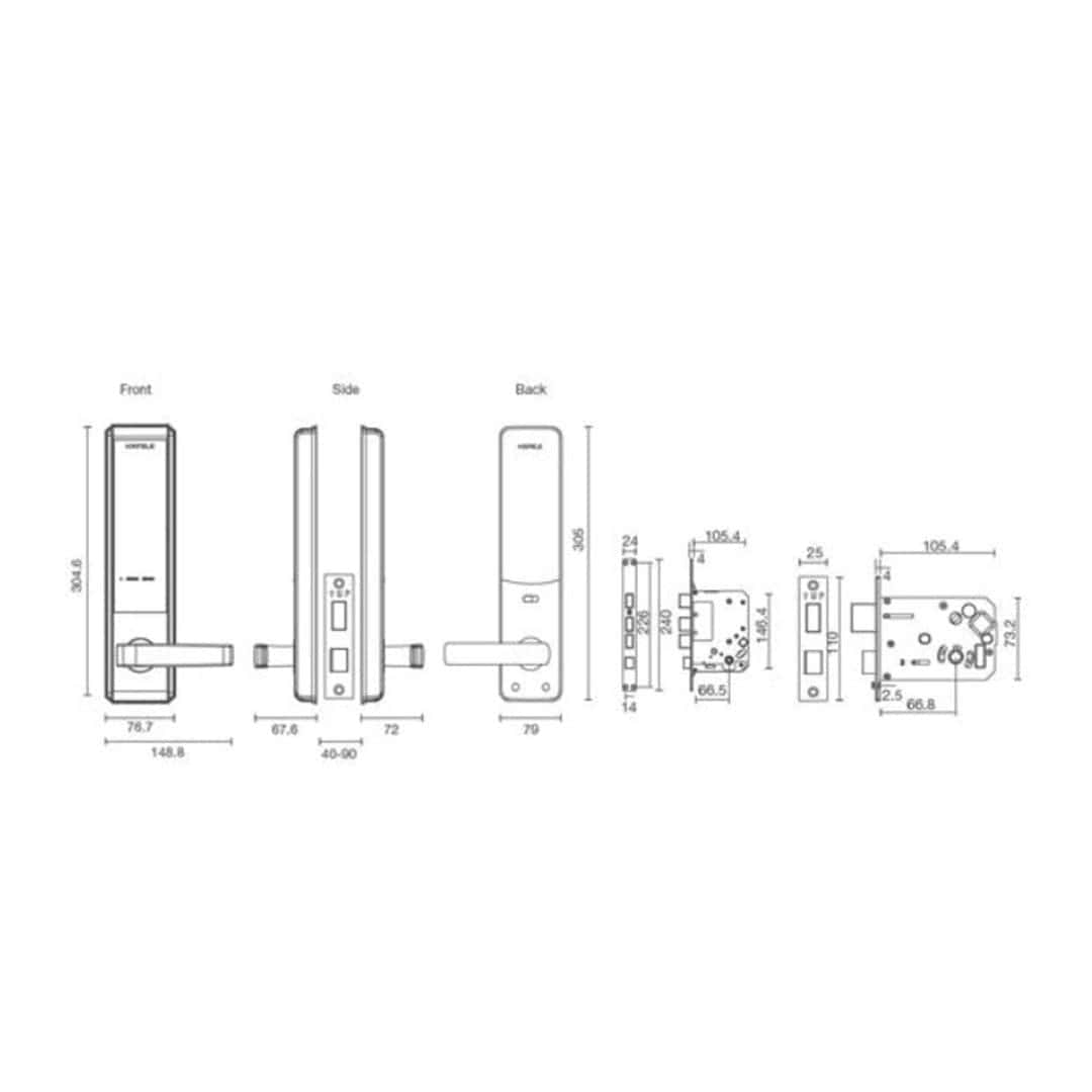 | Supplied with: | 1 Front and rear module 1 Striking plate 1 Set of fixing material 1 User manual 1 Installation template 8 pcs AA Alkaline batteries 4 Smart Cards 3 Mechanical keys |