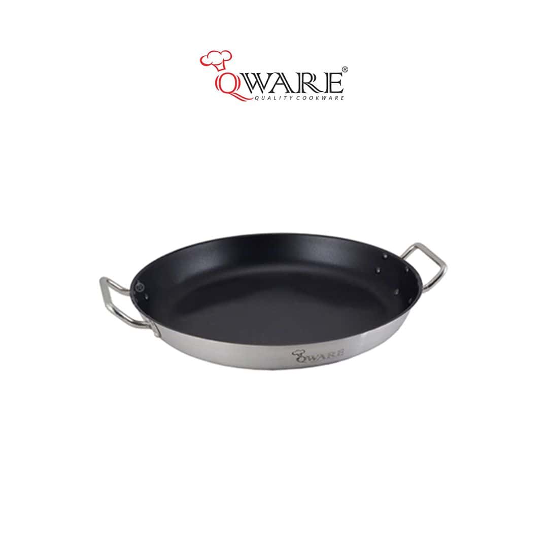 This Qware® Sandwich Bottom Non-stick Frying Pan’s riveted double handle with dual rivets assure a rigid connection between the handle and the body of the frying pan, hence providing a firm grip and higher security, and ideal for cooking Spanish Seafood Paella.