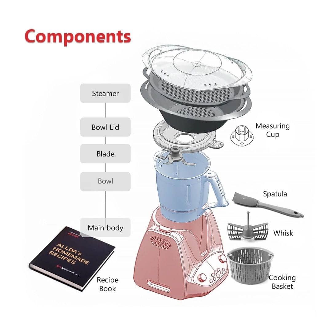 ***Include steamer (steamer plate, steamer lid), cooking bowl, bowl lid, measuring cup, cooking basket, whisk, spatula, blade, recipe book