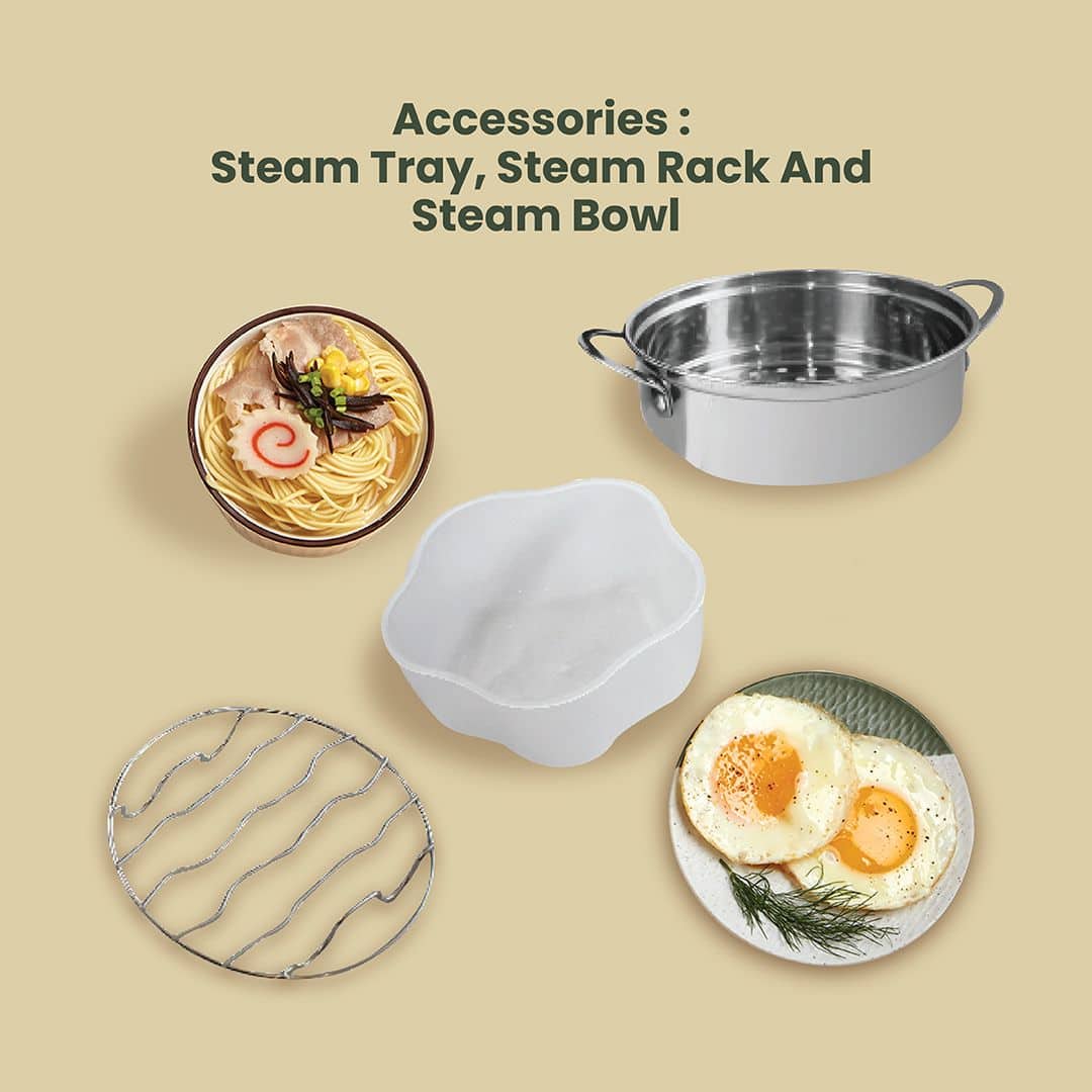 - Accessories: Steam tray, steam rack and steam bowl